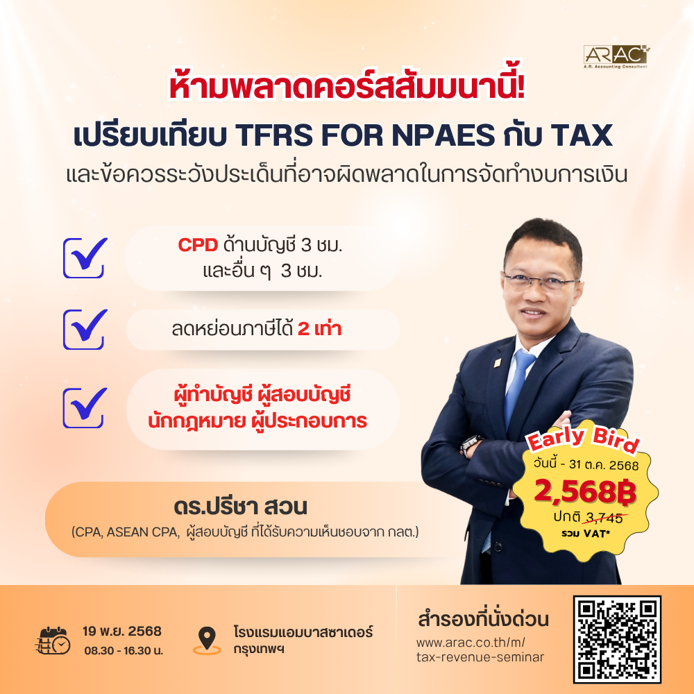 บริษัท เอ.อาร์. แอ็คเคานติ้ง คอนซัลแตนท์ จำกัด เตรียมจัดหลักสูตรสัมมนาในหัวข้อ “เปรียบเทียบ TFRS for NPAEs กับ TAX และข้อควรระวังประเด็นที่อาจผิดพลาดในการจัดทำงบการเงิน” ในวันพุธที่ 19 พฤศจิกายน 2568 ณ โรงแรมแอมบาสซาเดอร์ กรุงเทพฯ เพื่อตอบโจทย์ความท้าทายที่นักบัญชีและผู้ประกอบการต้องเผชิญจากความแตกต่างระหว่างมาตรฐานการรายงานทางการเงินและข้อกำหนดทางภาษี
